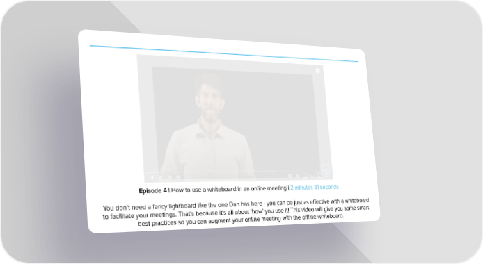 Episode 4 | How to use a whiteboard in an online meeting | 2 minutes 31 seconds You don’t need a fancy lightboard like the one Dan has here - you can be just as effective with a whiteboard to facilitate your meetings. That’s because it’s all about ‘how’ you use it! This video will give you some smart best practices so you can augment your online meeting with the offline whiteboard.