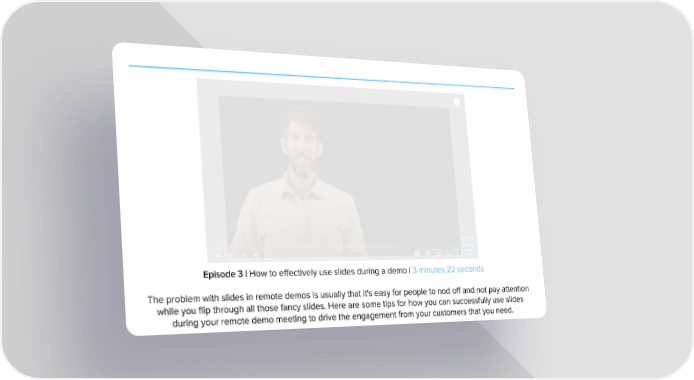 Episode 3 | How to effectively use slides during a demo | 3 minutes 22 seconds The problem with slides in remote demos is usually that it's easy for people to nod off and not pay attention while you flip through all those fancy slides. Here are some tips for how you can successfully use slides during your remote demo meeting to drive the engagement from your customers that you need.