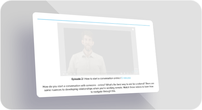 Episode 2 | How to start a conversation online | 5 minutes How do you start a conversation with someone - online? What's the best way to ask for a referral? There are some nuances to developing relationships when you're working remote. Watch these videos to learn how to navigate through this.