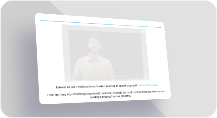 Episode 6 | Top 3 mistakes to avoid when building an impact proposal | 1 minute 37 seconds Here are three important things you should remember, to avoid the most common mistakes when you are sending a proposal to your prospect. 07 Building an Impact Proposal Page 5 Page 7Video Player is loading.Play VideoPauseSkip BackwardSkip ForwardUnmuteCurrent Time 0:02/Duration 1:38Loaded: 19.41%0:02Stream Type LIVESeek to live, currently behind liveLIVERemaining Time -1:36 1xPlayback RateChaptersChaptersDescriptionsdescriptions off, selectedCaptionscaptions settings, opens captions settings dialogcaptions off, selectedAudio TrackPicture-in-PictureFullscreenThis is a modal window.Beginning of dialog window. Escape will cancel and close the window.TextColorWhiteBlackRedGreenBlueYellowMagentaCyanOpacityOpaqueSemi-TransparentText BackgroundColorBlackWhiteRedGreenBlueYellowMagentaCyanOpacityOpaqueSemi-TransparentTransparentCaption Area BackgroundColorBlackWhiteRedGreenBlueYellowMagentaCyanOpacityTransparentSemi-TransparentOpaqueFont Size50%75%100%125%150%175%200%300%400%Text Edge StyleNoneRaisedDepressedUniformDrop shadowFont FamilyProportional Sans-SerifMonospace Sans-SerifProportional SerifMonospace SerifCasualScriptSmall CapsResetDoneClose Modal DialogEnd of dialog window.